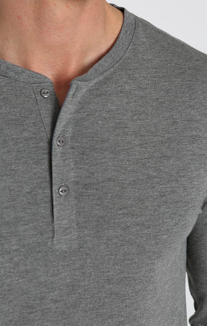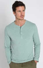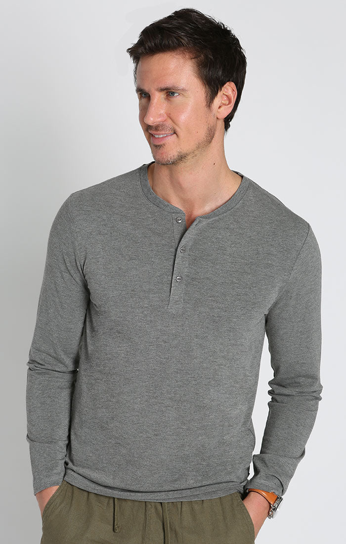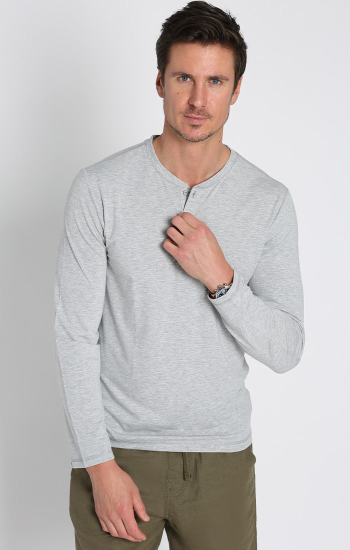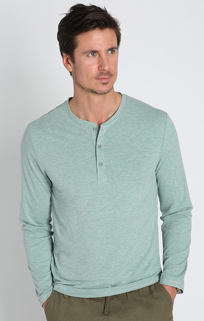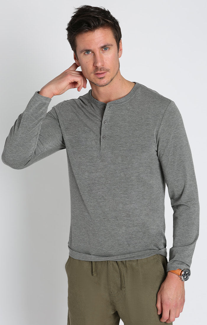 A soft and easy light weight polyester viscose blend fabric in a classic 3 button long sleeve henley.