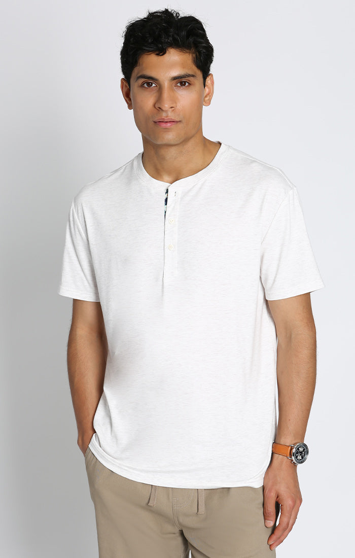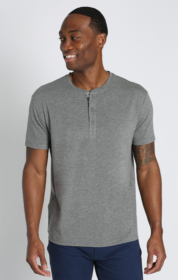 A soft and easy light weight polyester viscose blend fabric in a classic 3 button short sleeve henley.