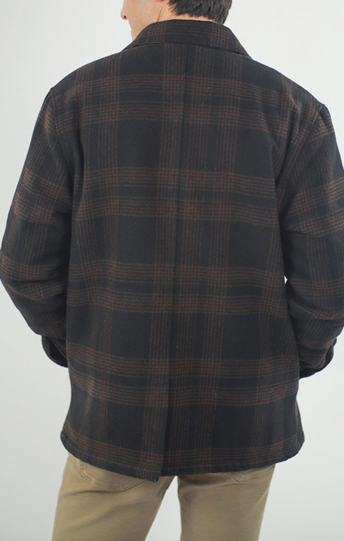 A unique wool blend CPO Jacket with sherpa lining and side pockets.